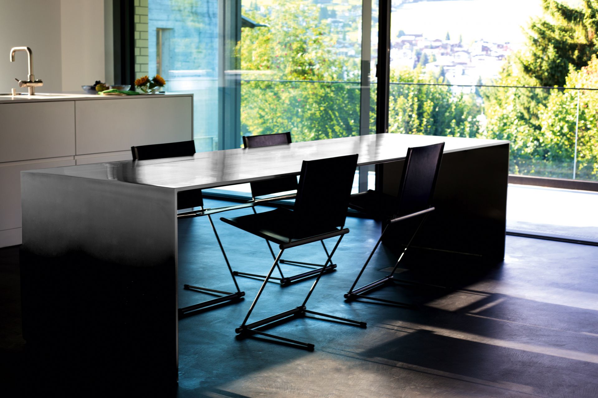 Caluzis Philosophie ist einfach. «Echtheit und Ehrlichkeit», umschreibt er sie selber knapp und klar. Nach diesen Vorgaben arbeitet er auch. So zum Beispiel bei einem Tisch, den er als Massanfertigung für einen Kunden herstellte. Die Familie wünschte sich einen grossen Esstisch und beauftragte Caluzi mit dem Design, der Materialauswahl und der Fertigung des Familientreffpunktes. Seine Idee erschien auf den ersten Blick einfach, erforderte in Wirklichkeit dann aber eine intensive Planung. Das Resultat ist ein drei Meter langer Tisch aus 500 Kilogramm Edelstahl. Puristische Eleganz schlechthin.